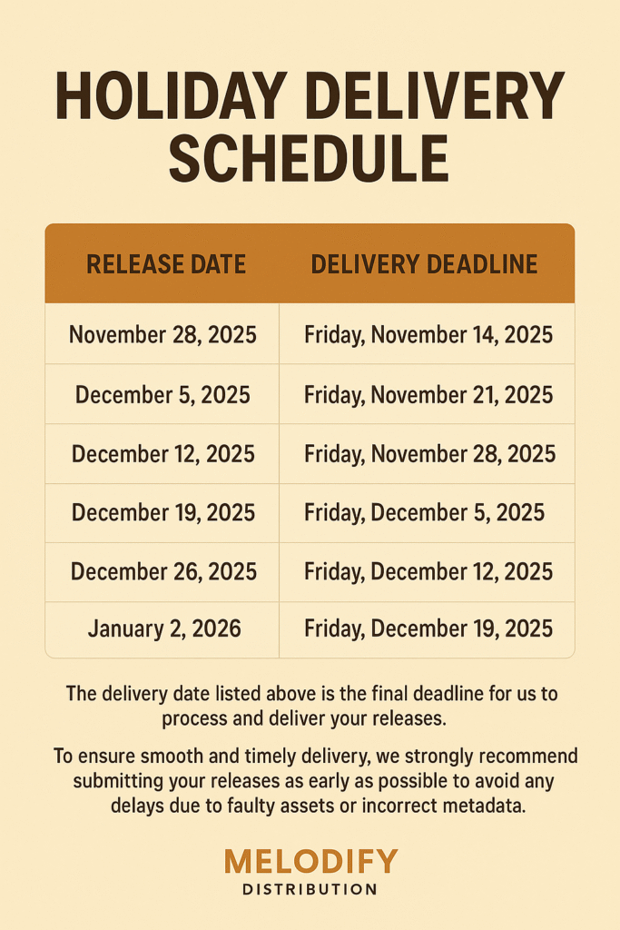 To ensure smooth and timely delivery, we strongly recommend submitting your releases as early as possible to avoid any delays due to faulty assets or incorrect metadata.
